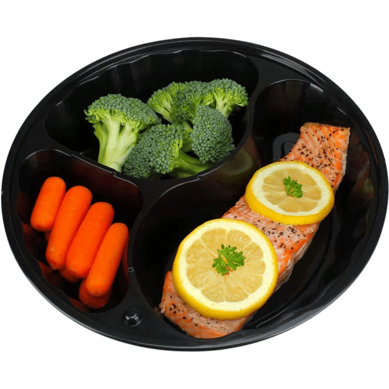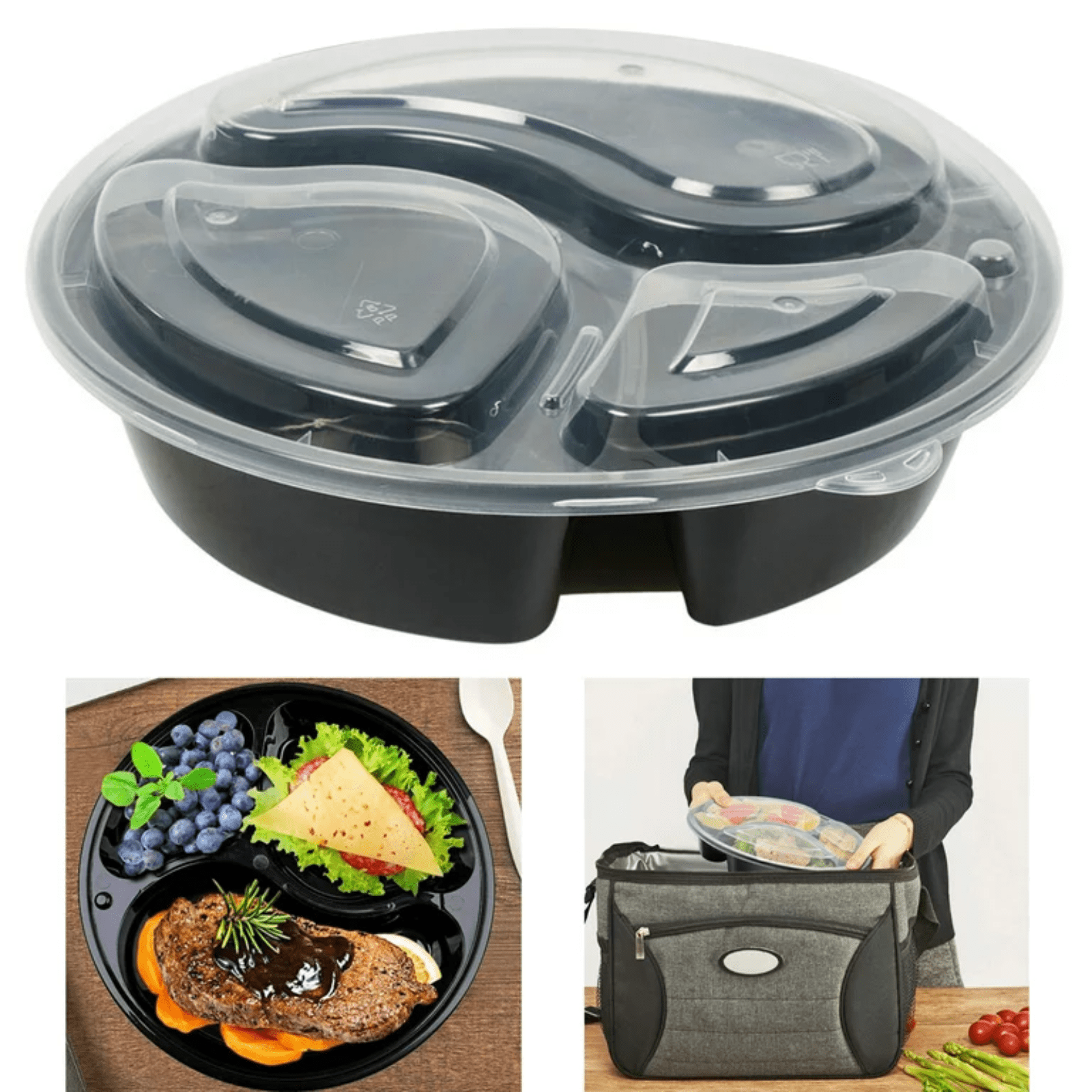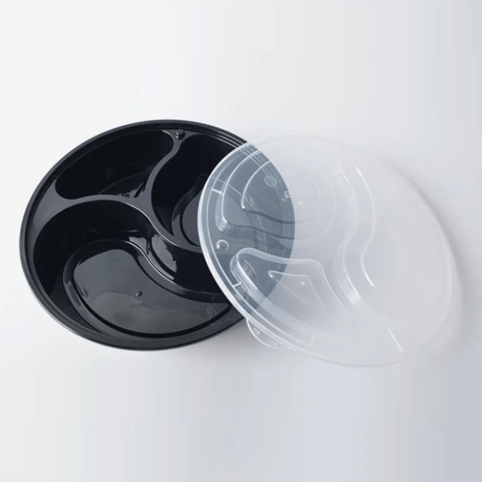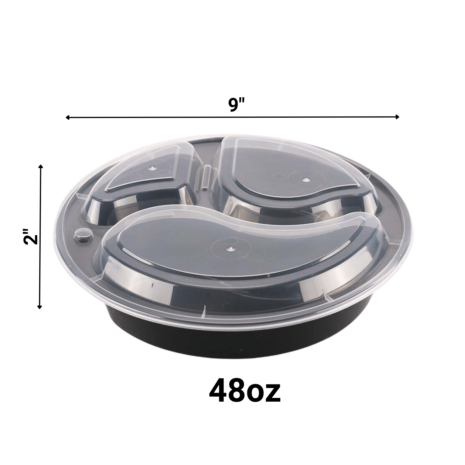 Introducing our versatile 48 oz. 3 Section Black Round Microwavable Container with Clear Lid, Lunch Box, and Plastic Take-Out Food Containers, meticulously crafted to elevate your take-out service.